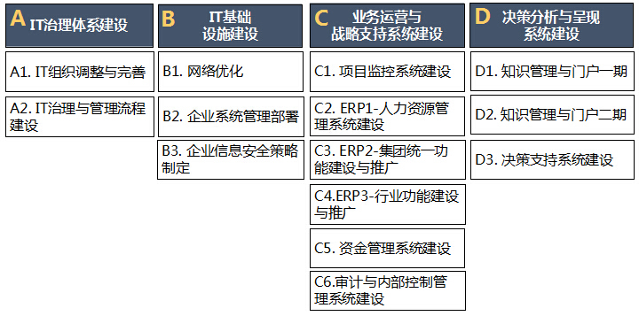 通过体系性的梳理,从IT治理、IT基础设施、应用系统三个方面、四大步骤以项目来进行定义.